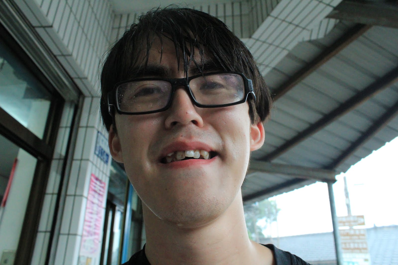 路途中,雨水讓我們成了這副德性,各個頂著粄條頭髮,眼鏡鏡片懸滿水珠。