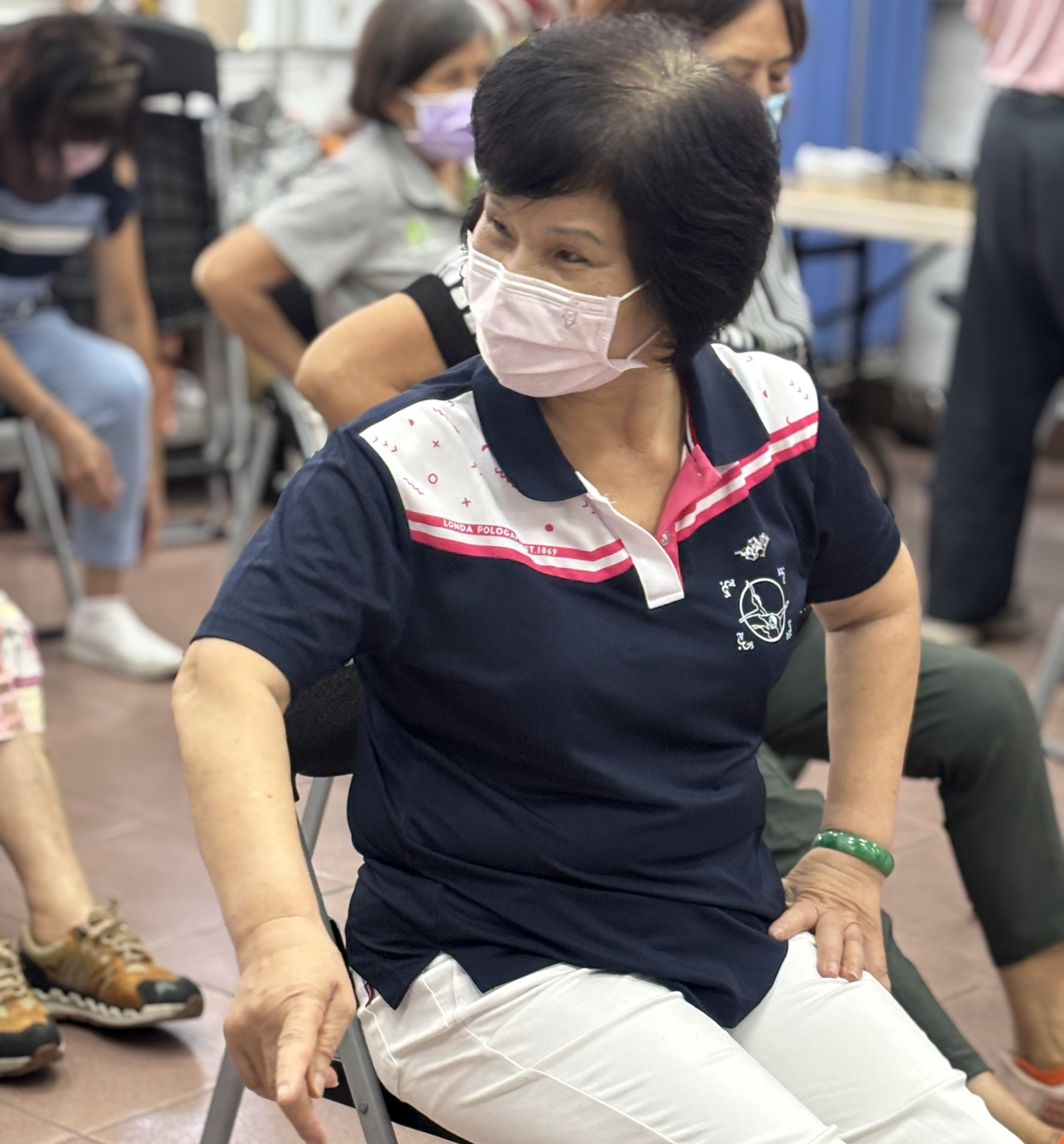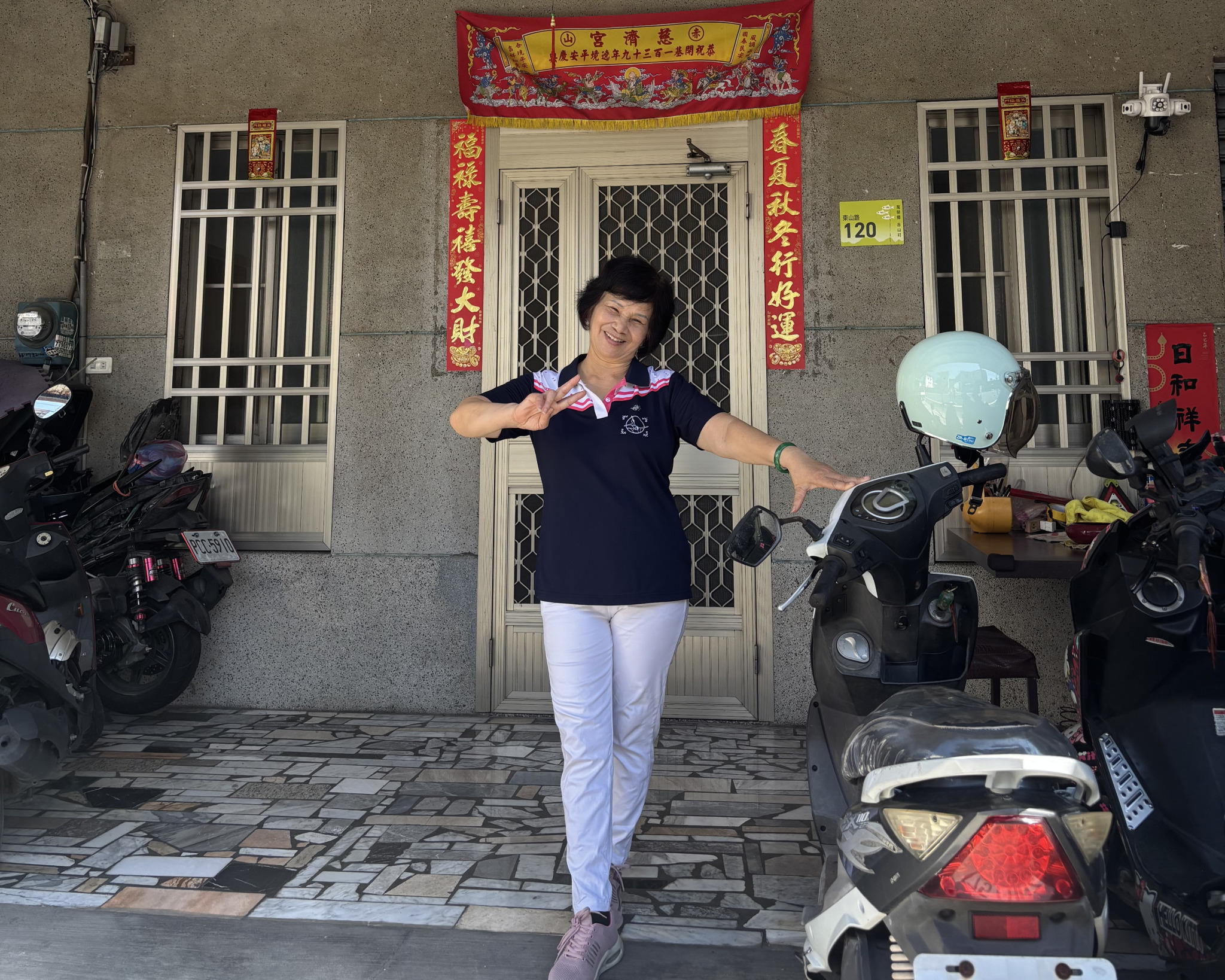多才多藝的阿嬤平時除了星期二、四到赤山據點跳國標外,平日的其他天也會到五溝水學習跳恰恰。阿嬤謙虛的說自己跳舞只是當作一種運動,但看著阿嬤手機裡一部部到處征戰表演的影片就知道阿嬤應該相當的享受舞台、樂於表現。據阿嬤所說,據點他一年多前才正式加入,「那時候只是去練銀閃閃表演,看到兩位老師都很有趣,就加入了。」雖然算是據點菜鳥,阿嬤比賽卻常常站在C位喔!