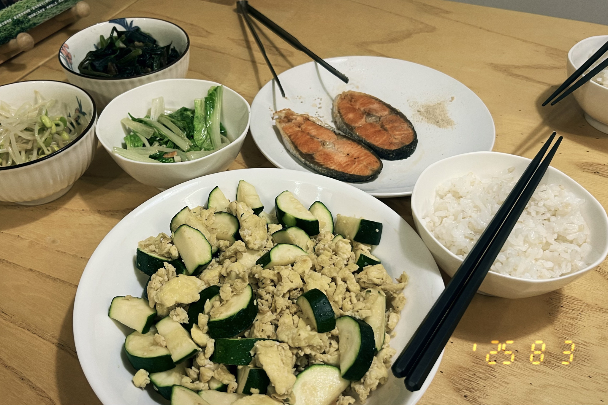 晚餐我們炒了櫛瓜炒蛋,結果是運氣遊戲,因為有些沒有很熟,但熟了的很好吃,只能憑感覺挑出好吃櫛瓜,但我們還是各自吃了很多飯,我吃了5碗⋯⋯