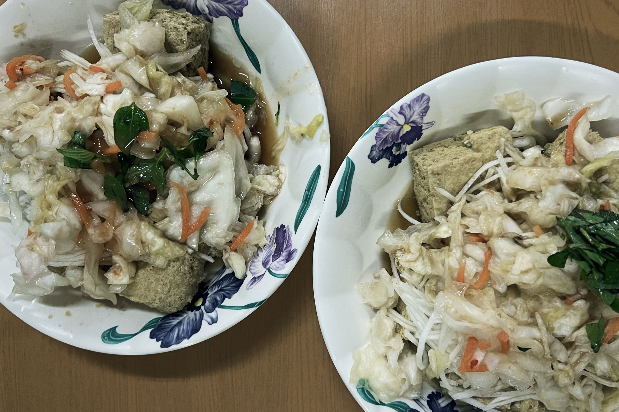 咬下臭豆腐的那瞬間,我們終於明白為什麼現在已經變成觀光名店的橋頭臭豆腐依舊在玉里人的心中歷久不衰。清爽大量的醃蘿蔔絲與台式泡菜覆蓋在外酥內嫩的臭豆腐上,不用像平常吃臭豆腐時總是擔心泡菜不夠,在這裡可以每一口都搭配到解膩的泡菜,簡直是最幸福的事了⋯⋯(偷偷跟大家說,玉里本店真的是最好吃的)