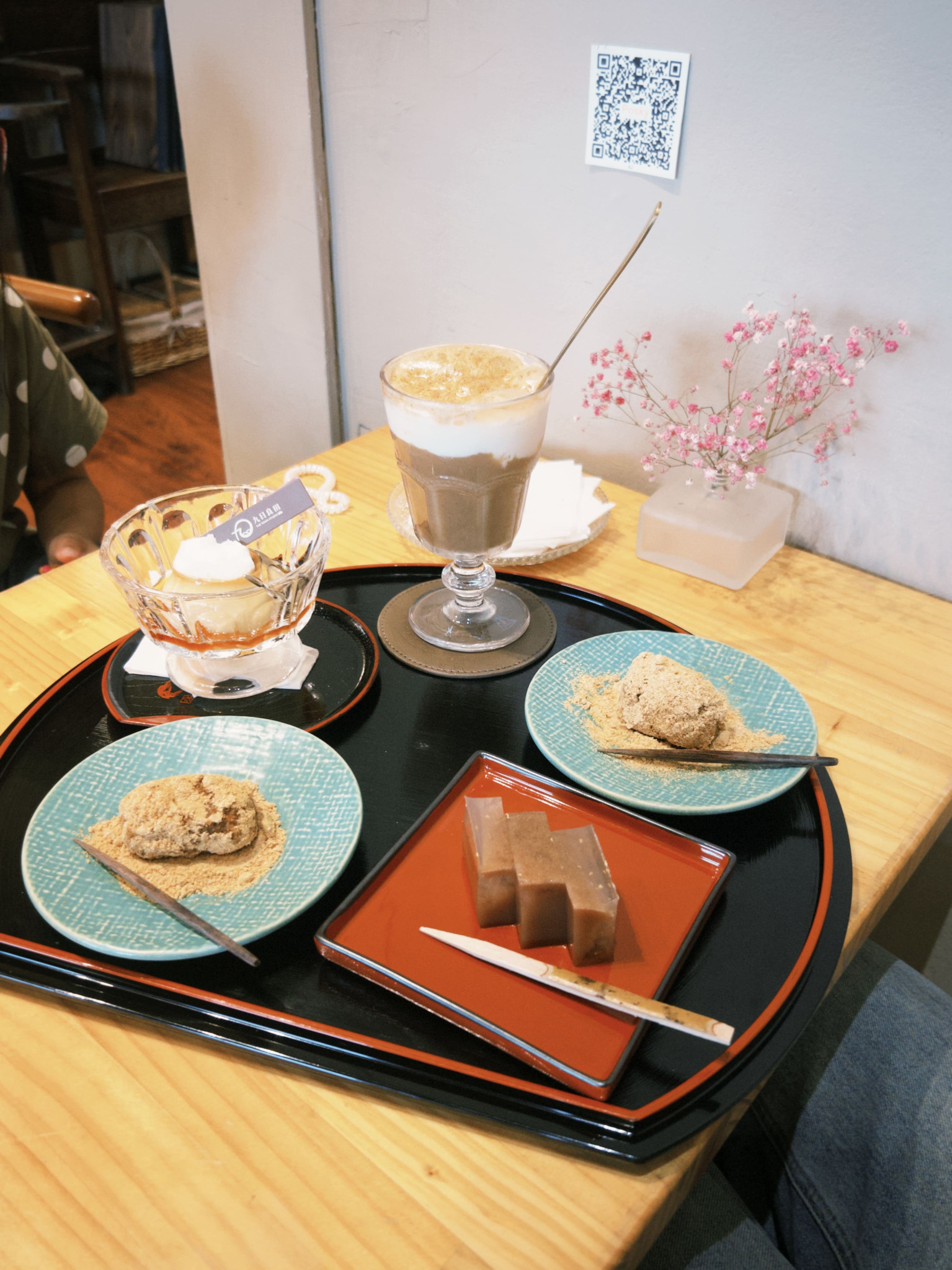 我們點了特色的牡丹餅、水羊羹,水羊羹據說是日本以前拿來招待貴族的糕點,所以表面會撒上金箔,還點了焦糖布丁,風味很特別,濃醇的鮮奶油中和了焦糖的苦澀,形成絕妙的韻味。