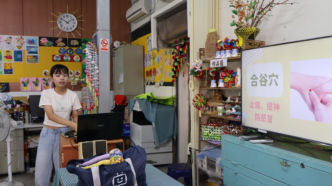 課程一開始先由艾草的功效切入,連結到的是稍後會著手製作的艾草按摩棒。接著便介紹了幾個像是曲池穴、合谷穴等可用於日常保健的穴道,包括位置與功效,並帶領阿公阿嬤上手按壓。在一次次的讀秒聲中,眼前上演的是一群人一心二用的畫面,邊吸著棒棒冰邊按摩穴道,看上去有些滑稽。