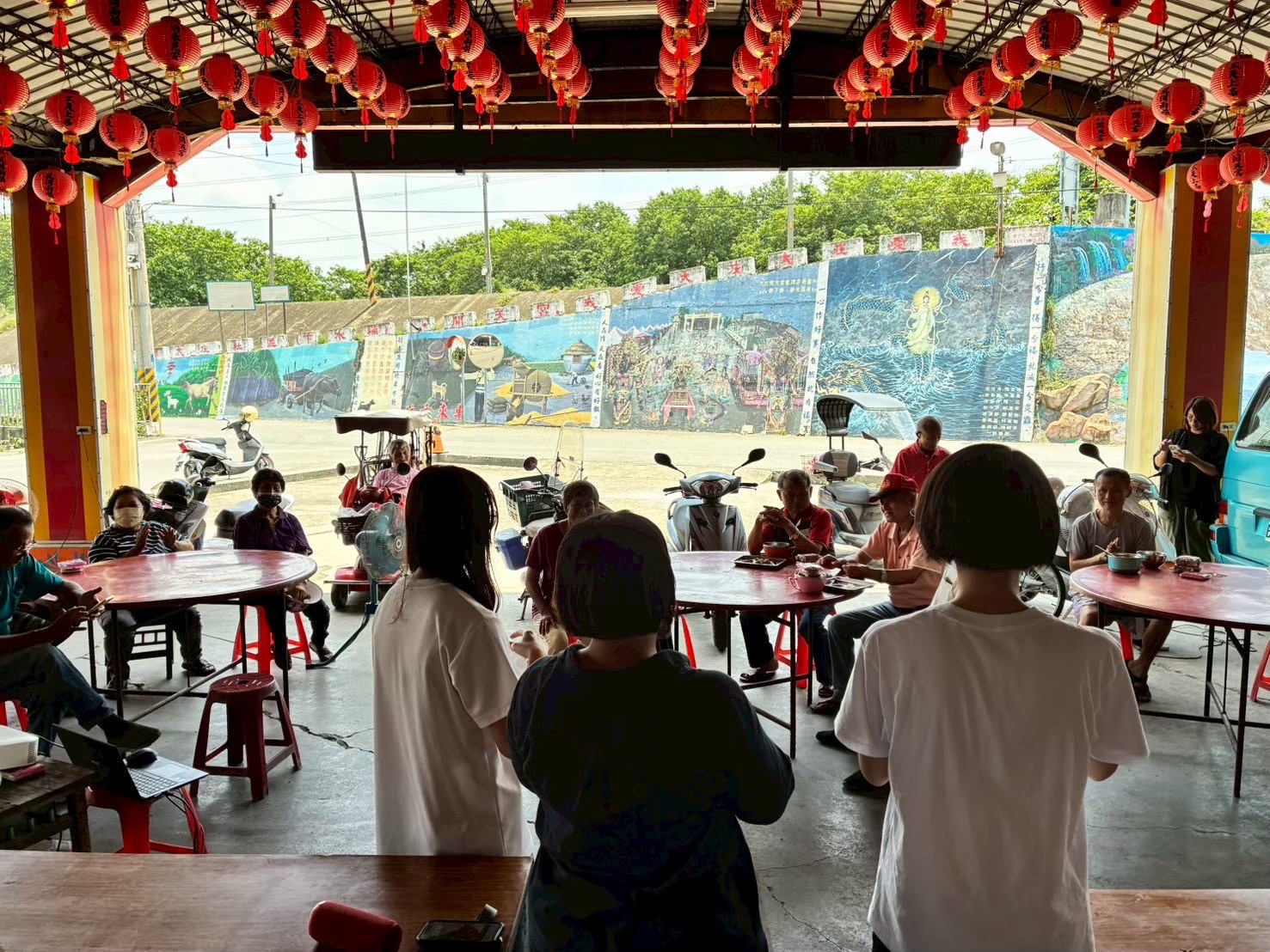 初次和協會夥伴們見面的中午,我們生澀的提出一個個問題,舉凡能不能拍照、東西要放哪裡、路上看到的事物等等什麼都問。第二天中午第一次和大庄村村長、照服員見面,也只能用提問填滿初來乍到的空白,漸漸組成一段談話,宛萍也拿起手機錄影,在回程路上我們才後知後覺的發現,那其實就是個訪談的機會,可以也應該被我們記錄下來。
