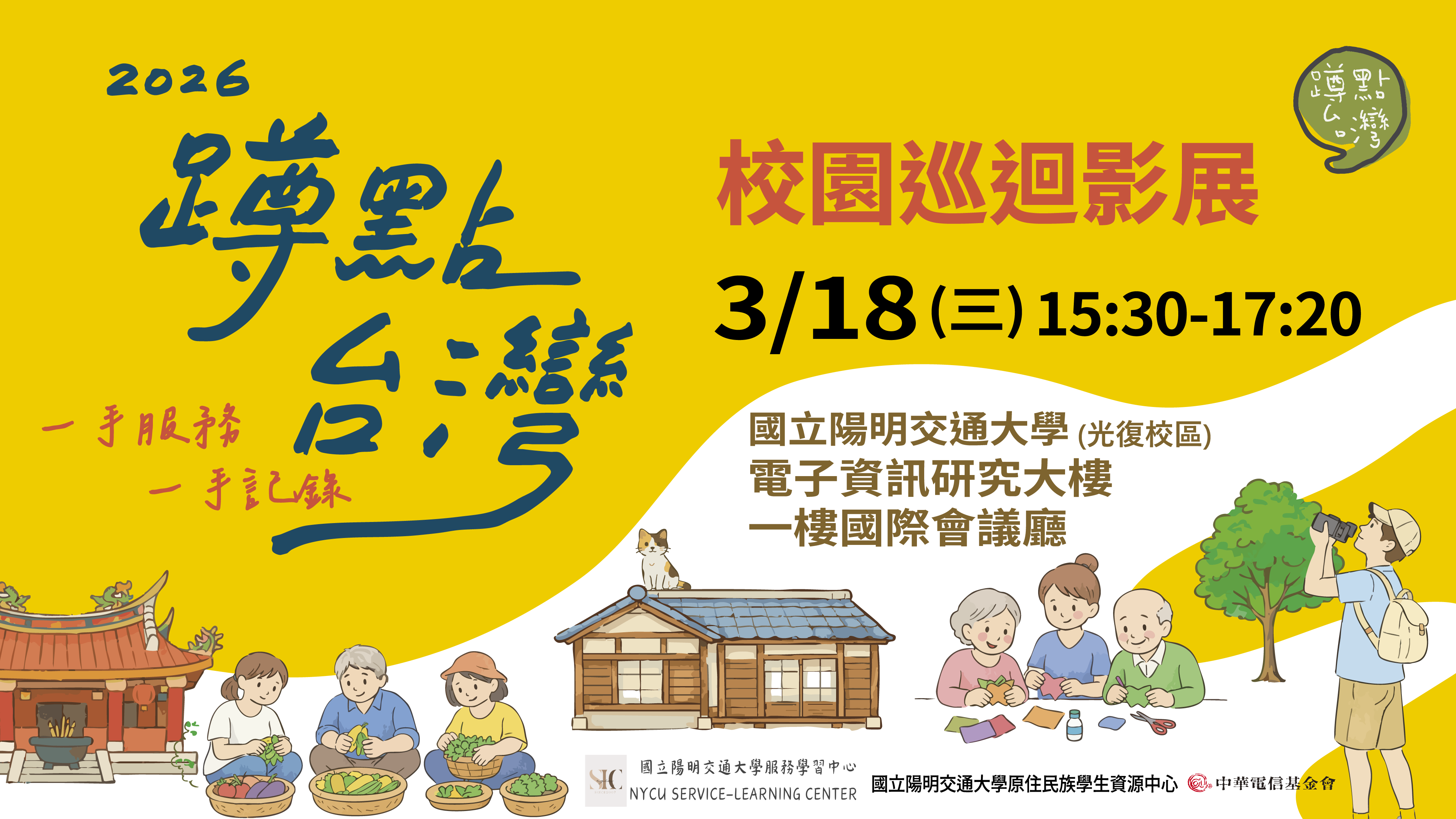 2026 春展 國立陽明交通大學 ∣ 場地: 光復校區 電子資訊研究大樓1樓 國際會議廳 影展時間2026/03/18 - 15:30 - 17:20 影展地點光復校區 電子資訊研究大樓1樓 國際會議廳 協辦單位服務學習中心、原住民族學生資源中心 【新竹五峰清泉天主堂】獲2025大賞獎 【台東南迴土坂部落】獲2025最佳服務獎、數位多媒體創作獎