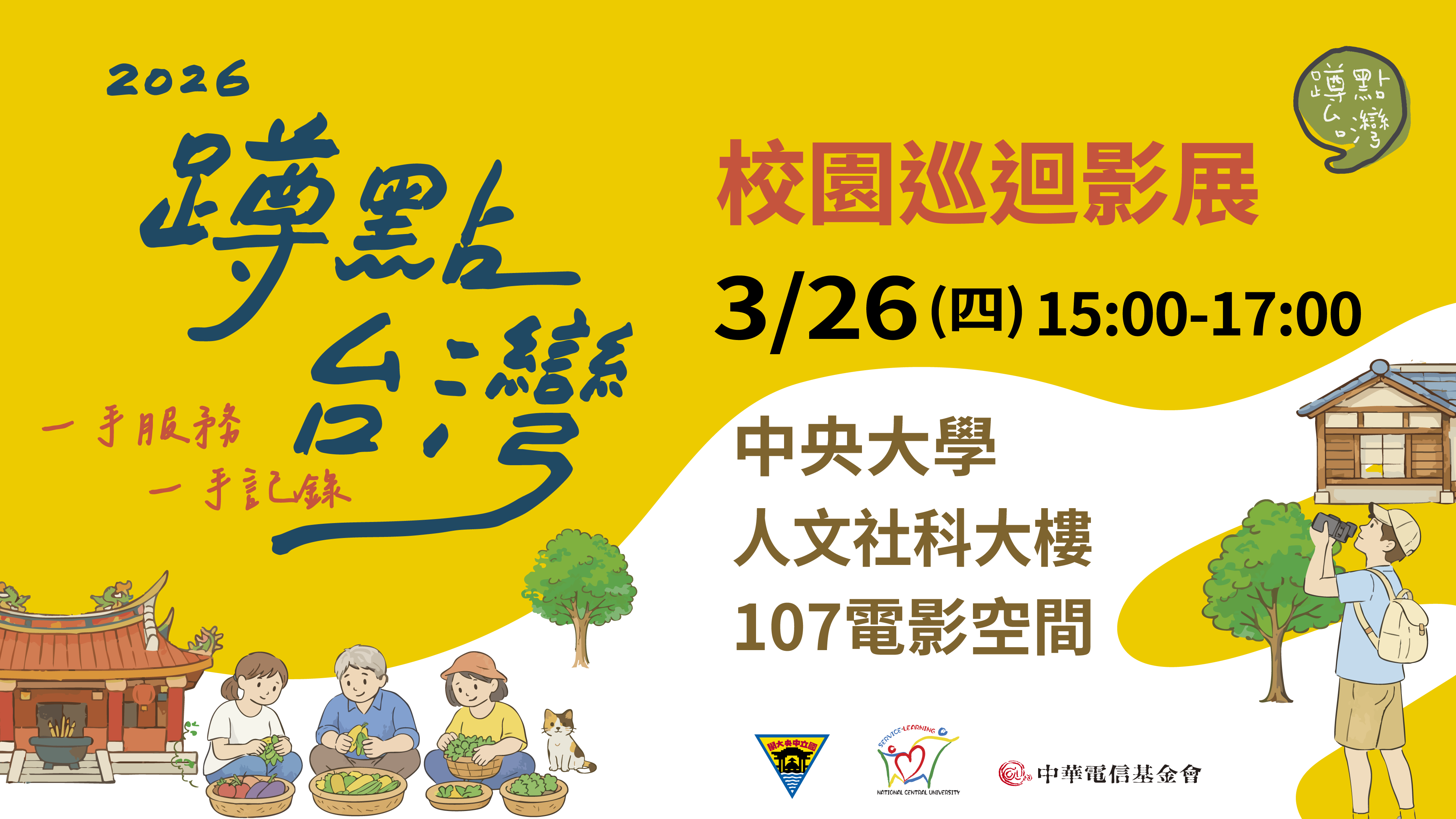 2026 春展 國立中央大學 ∣ 場地: 人文社科大樓1F 107電影空間 影展時間2026/03/26 - 15:00 - 17:00 影展地點人文社科大樓1F 107電影空間 協辦單位服務學習發展中心 【嘉義古民社區】獲2025社區紀錄片獎 【宜蘭東岳社區】