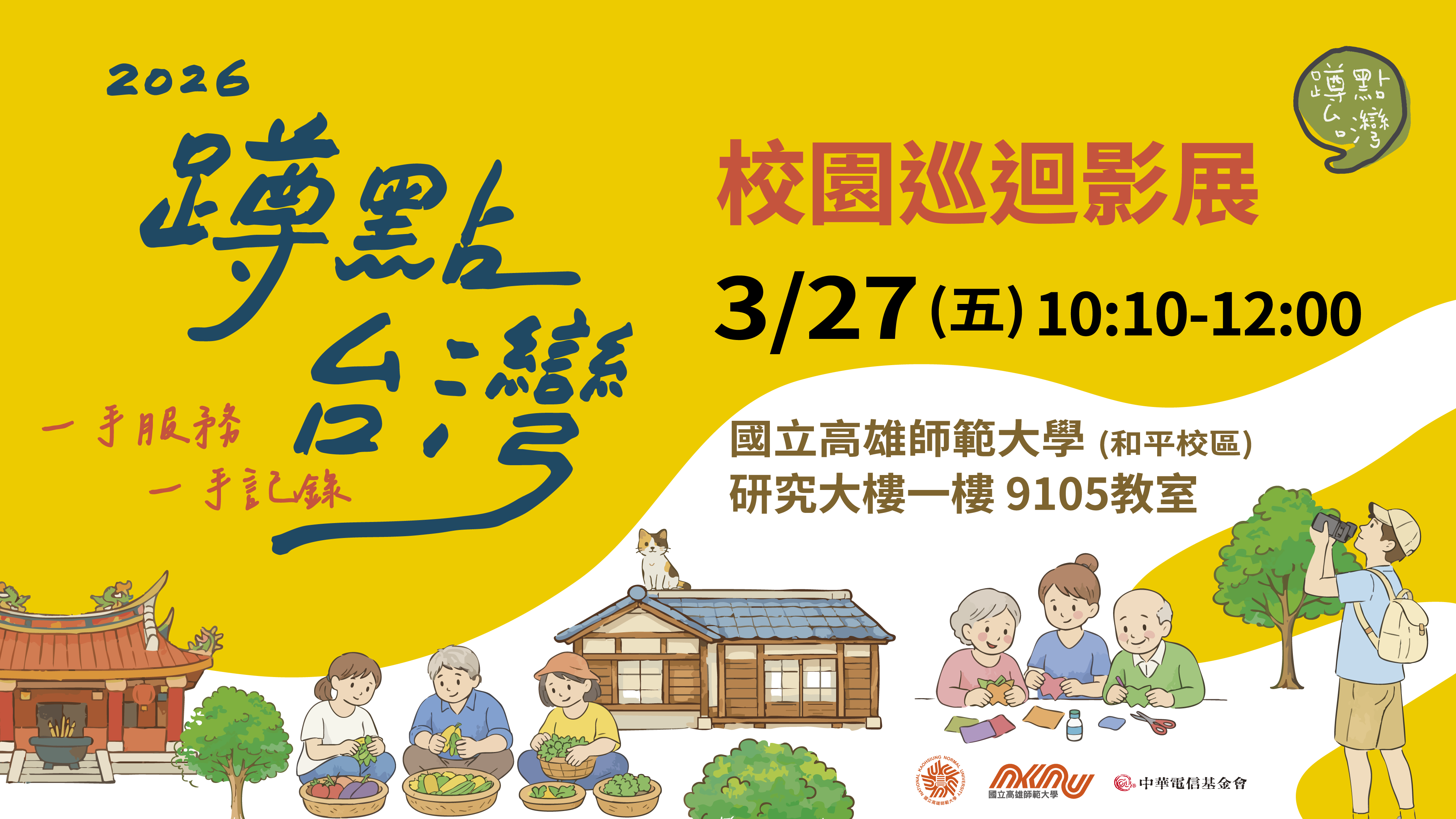 2026 春展 國立高雄師範大學 ∣ 場地: 和平校區 研究大樓1F 9105 影展時間2026/03/27 - 10:10 - 12:00 影展地點和平校區 研究大樓1F 9105 協辦單位通識教育中心 【基隆武崙社區】 【彰化市Formosa玩具基地】