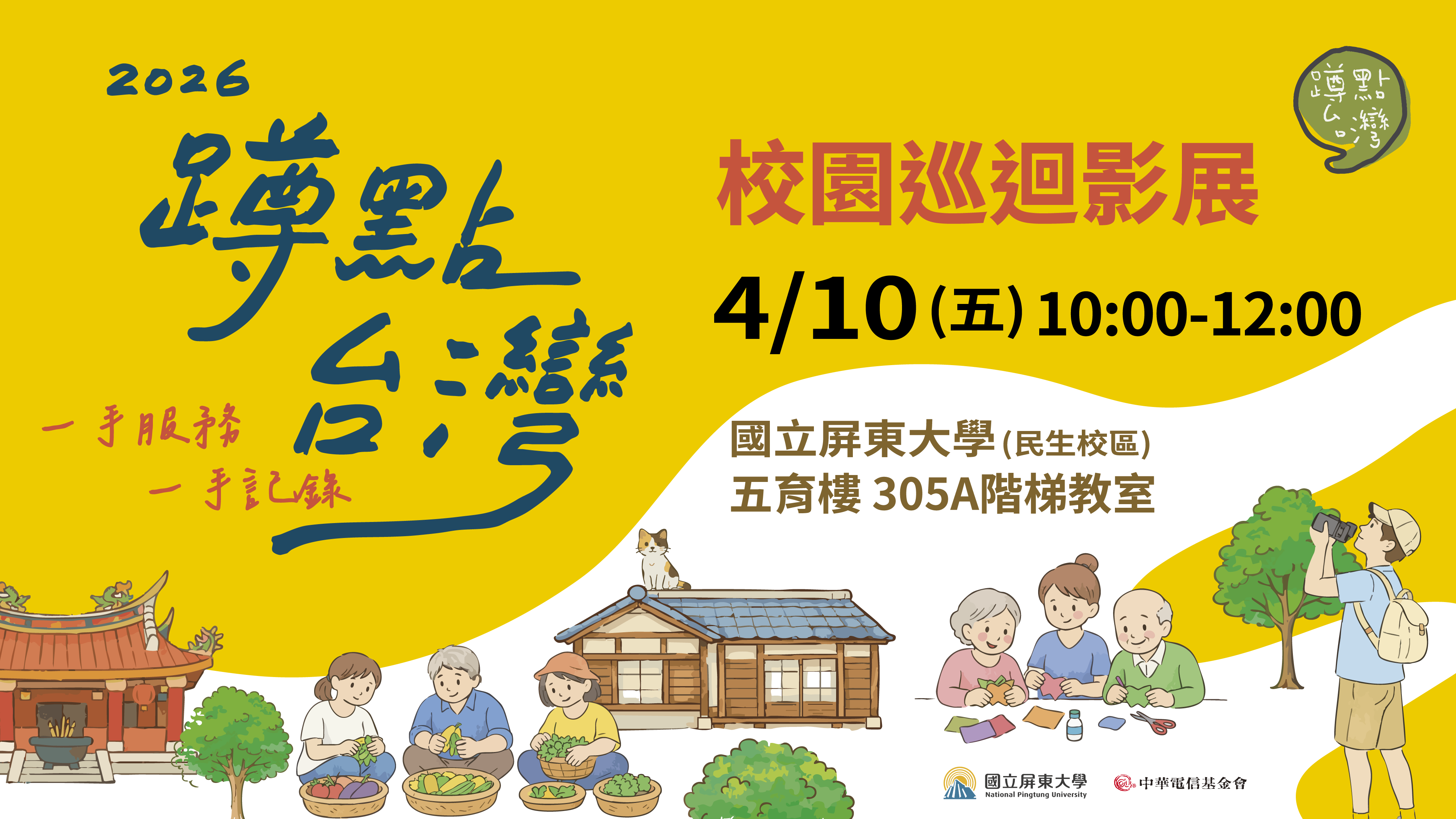 2026 春展 國立屏東大學 ∣ 場地: 民生校區 五育樓 305A階梯教室 影展時間2026/04/10 - 10:00 - 12:00 影展地點民生校區 五育樓 305A階梯教室 協辦單位 【屏東赤山社區】 獲2025最佳服務獎 【嘉義古民社區】獲2025社區紀錄片獎