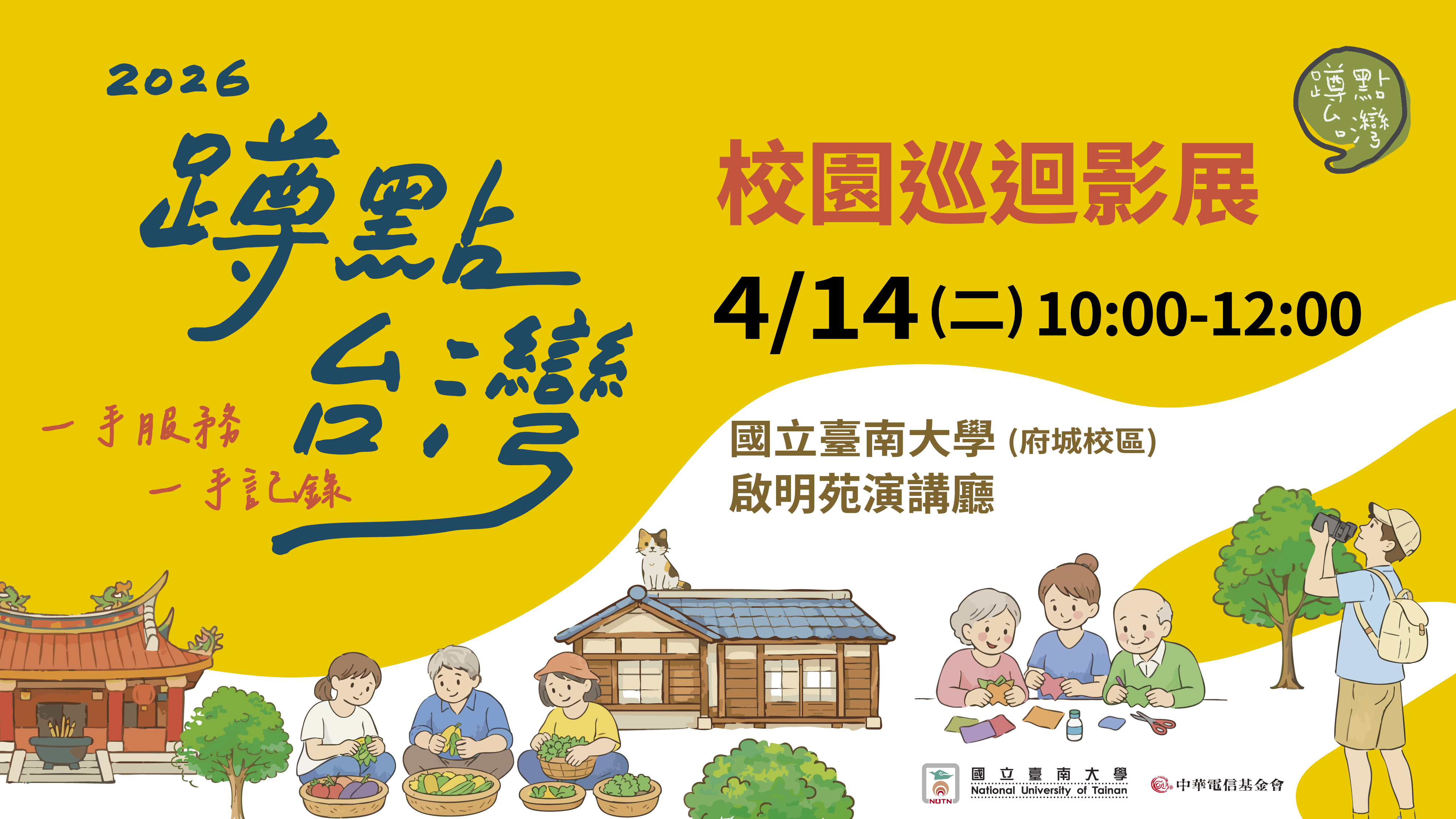 2026 春展 國立臺南大學 ∣ 場地: 府城校區 啟明苑 演講廳 影展時間2026/04/14 - 10:00 - 12:00 影展地點府城校區 啟明苑 演講廳 協辦單位通識教育中心 【彰化溪州莿仔埤圳產業文化協會】獲2025大賞獎 【嘉義古民社區】獲2025社區紀錄片獎